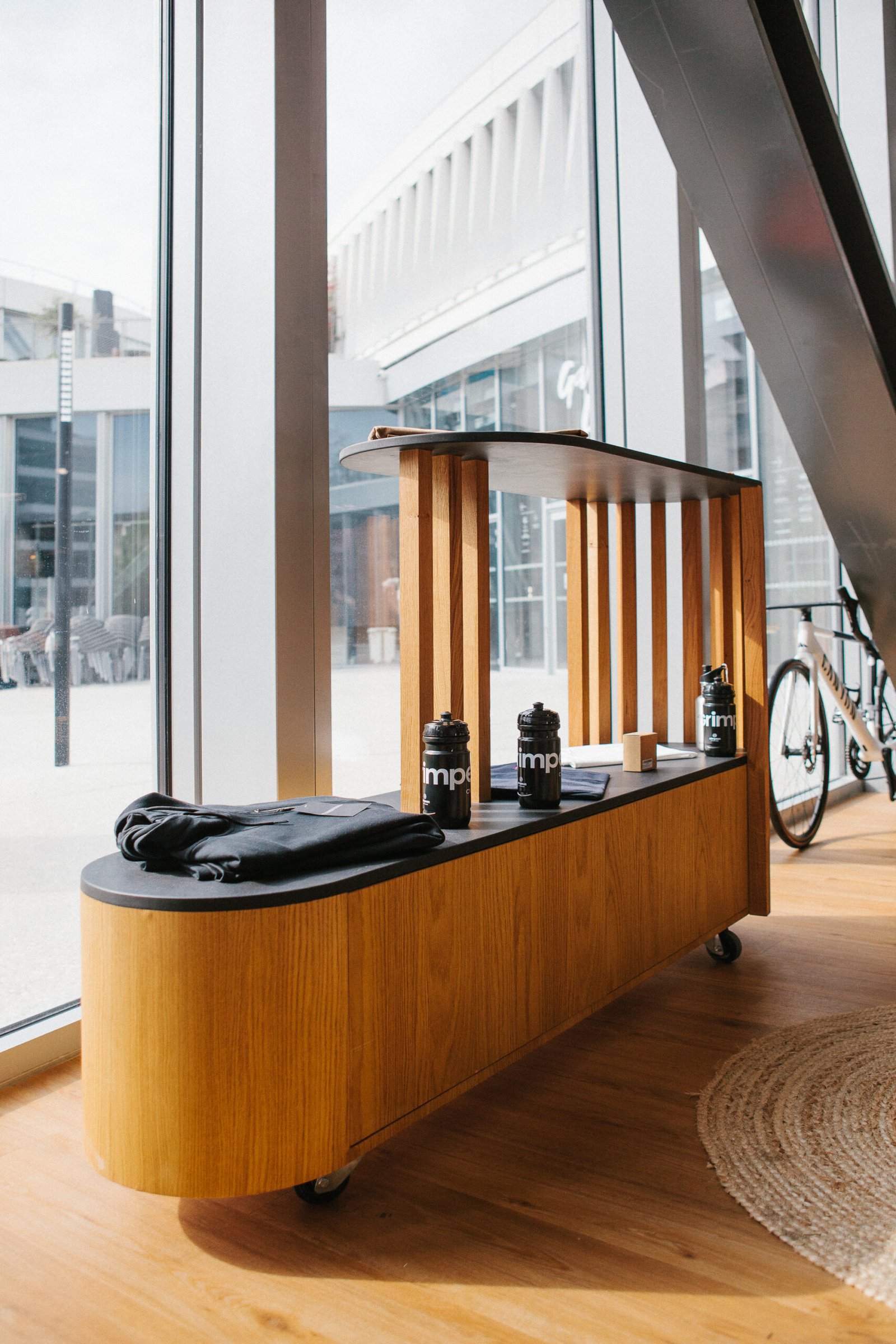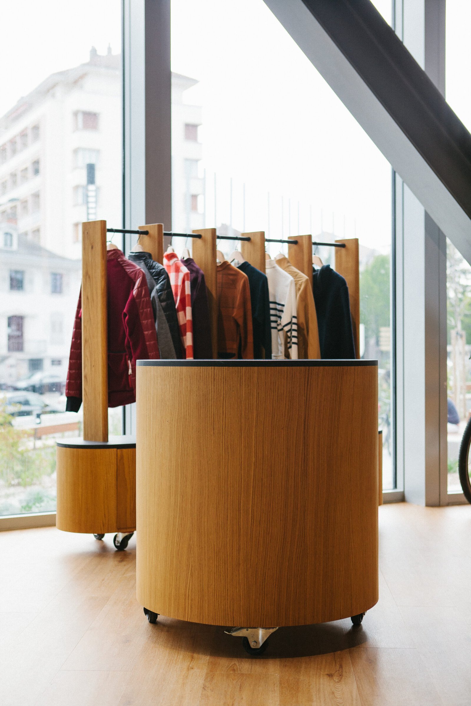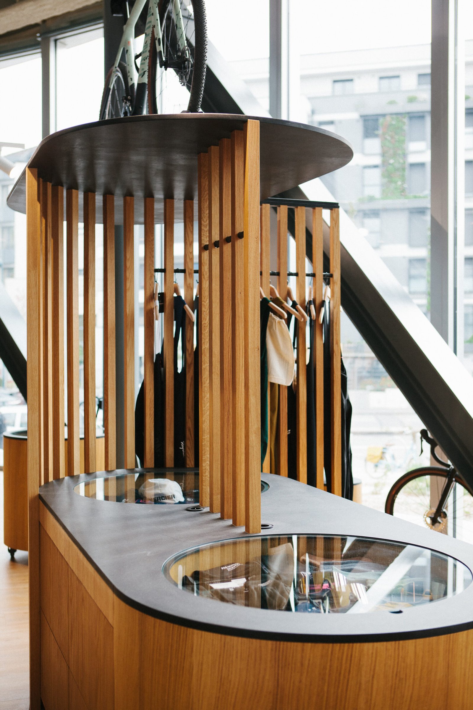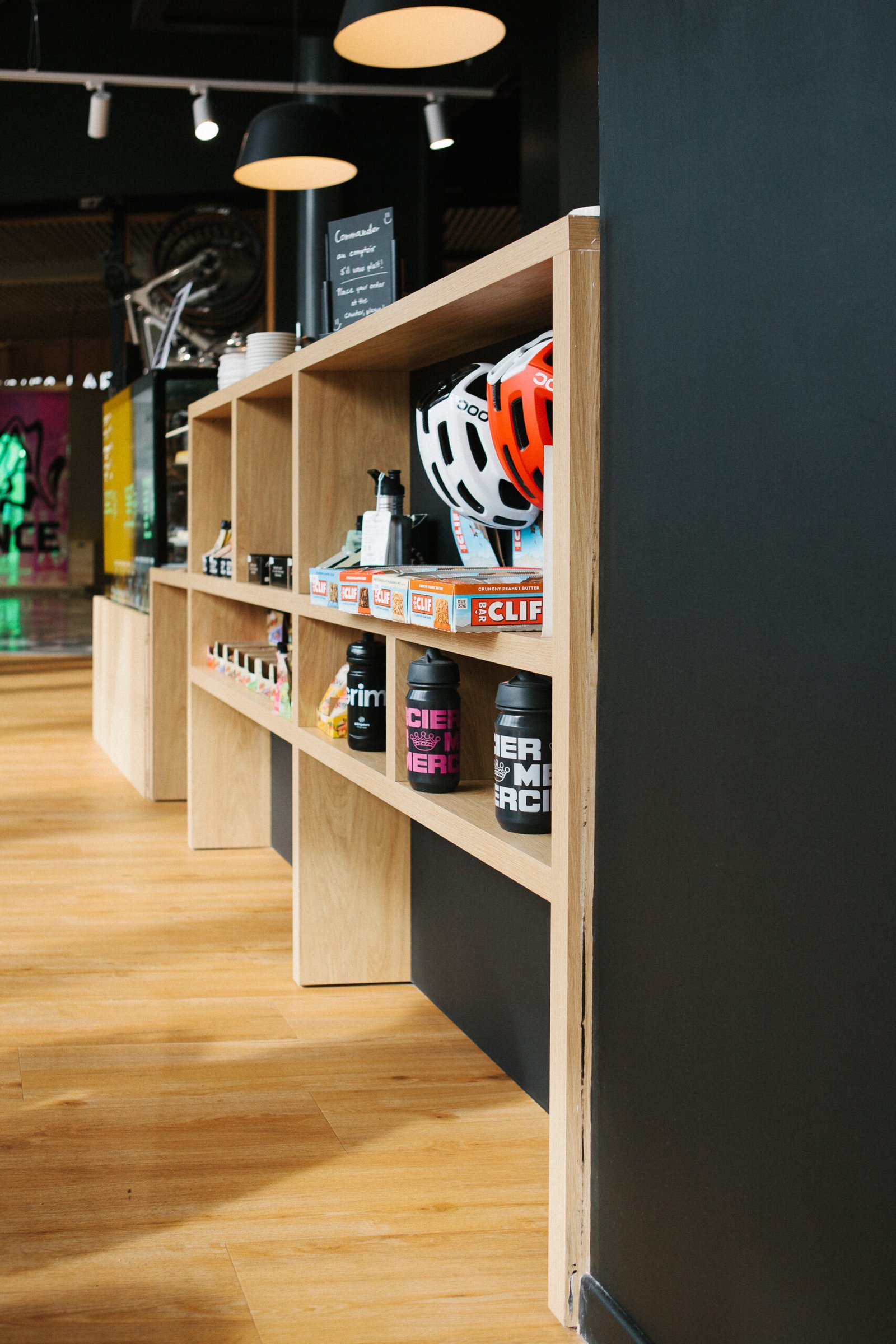 Manufacture and installation of furniture for a bicycle shop: mobile furniture and wall fittings for clothing, bicycles, and accessories. Layout of café and workshop areas.